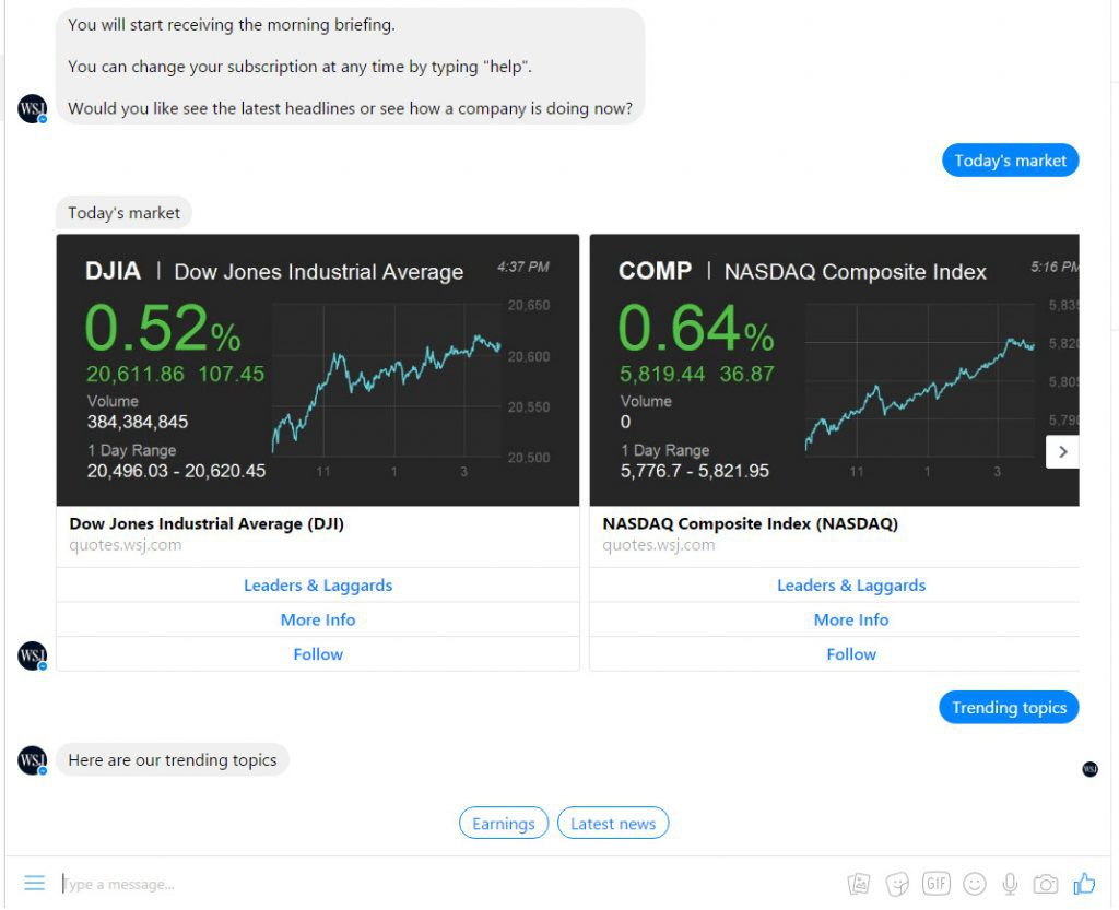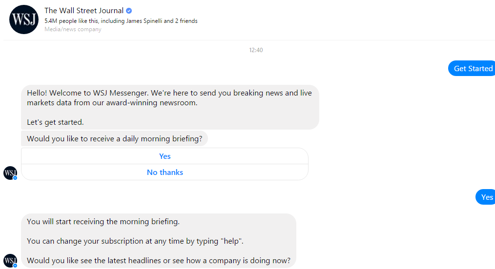 The Wall Street Journal uses a Messenger bot that sends their opt-ins breaking news on a number of topics each day.