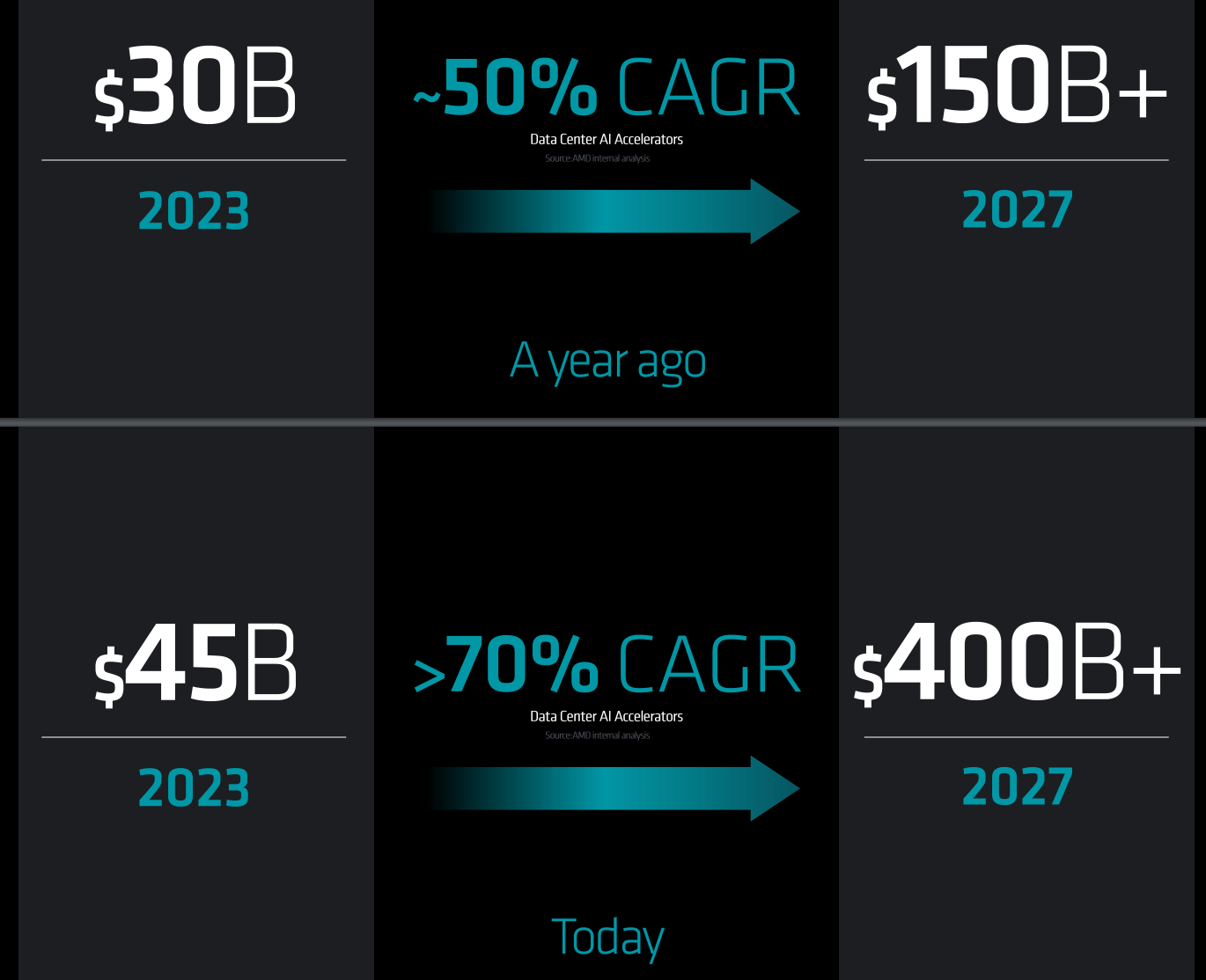 AMD's CEO also revealed an even more staggering figure for Data Center AI forecast, with current valuations exceeding $400 billion. This rapid escalation signifies a dramatic underestimation of AI's impact, revealing an evolving landscape where the true scale of AI's influence is just beginning to unfold.