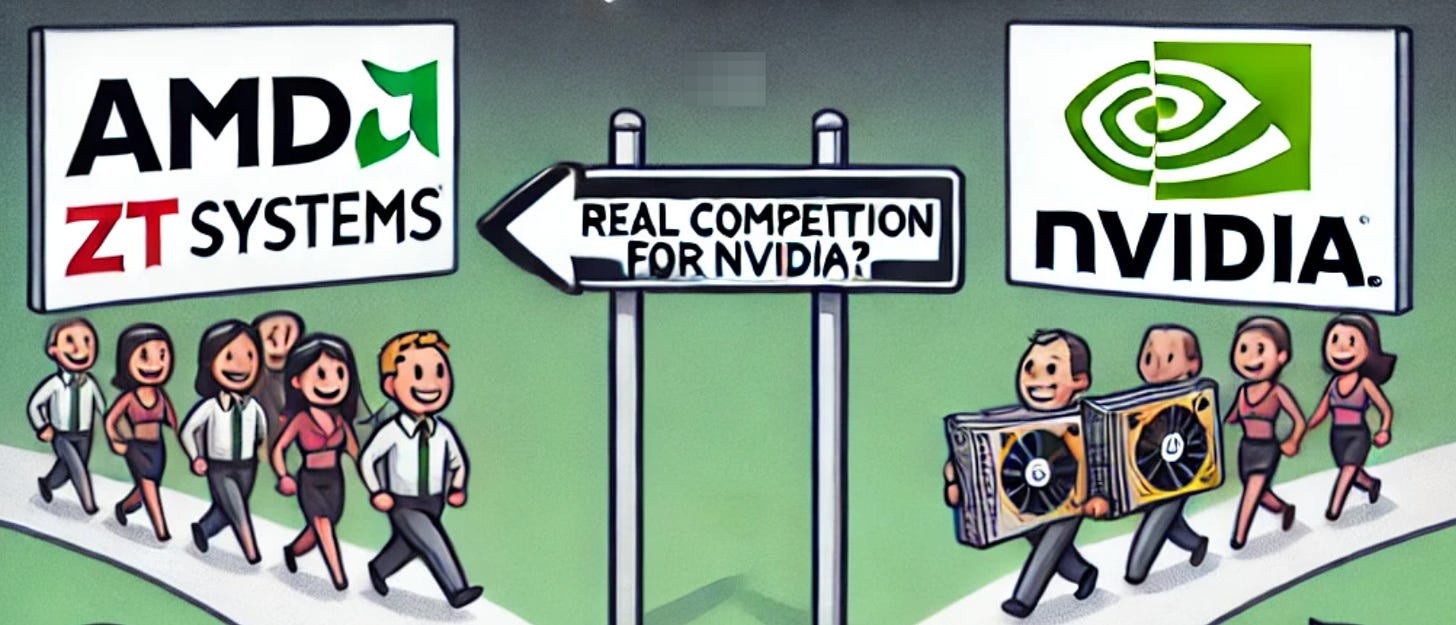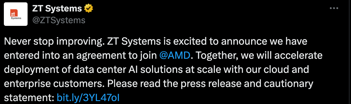On August 19, 2024, AMD announced its plans to acquire ZT Systems, a server maker, for $4.9B. Based on AMD's recent earnings transcript, the key reason for acquisition is this will enable AMD to offer more comprehensive, optimized rack-scale solutions, which are essentially monopolized by NVIDIA.