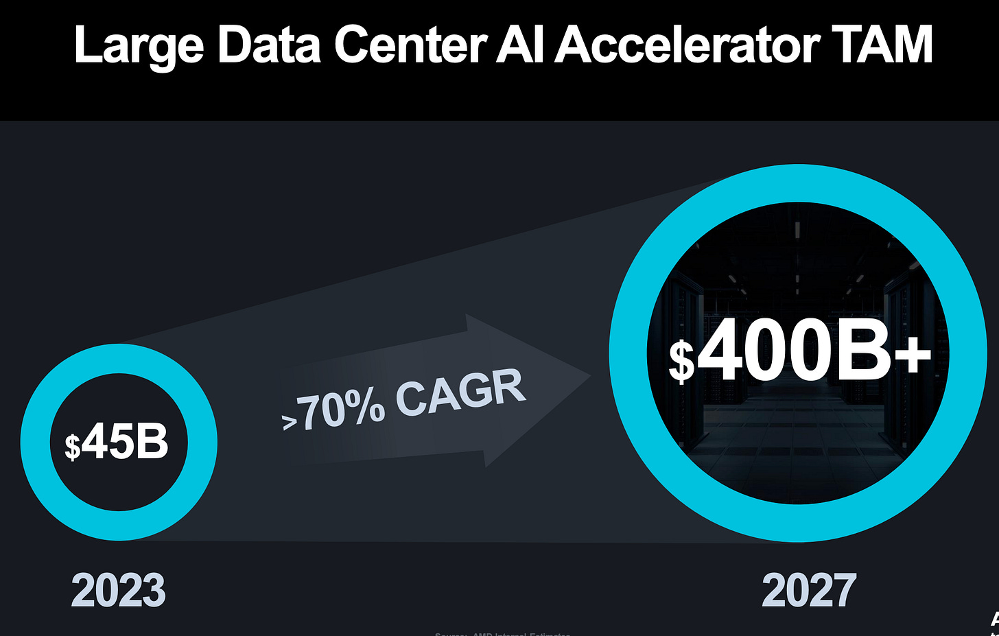 The Total Addressable Market (TAM) for data centers is projected to reach $400 billion by 2027, reflecting a significant CAGR driven by the growing demand for cloud computing, AI workloads, and edge computing. AMD CEO Lisa Su emphasized that the company has been making substantial investments in its long-term AI strategy to capture a share of this expanding $400 billion TAM, positioning AMD to capitalize on the rapidly evolving data center landscape.