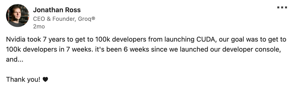 Groq has 70,000 new developers are using Playground and more than 19,000 new applications are running via the Groq API. This company, founded by ex-Google engineers, has been making waves in the AI hardware industry, growing at an impressive pace that rivals and even surpasses the early growth trajectory of NVIDIA.