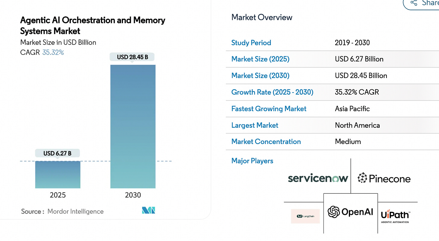 Per Mordor, The Agentic AI Orchestration And Memory Systems Market size is estimated at USD 6.27 billion in 2025, and is expected to reach USD 28.45 billion by 2030, at a CAGR of 35.32% during the forecast period (2025-2030).