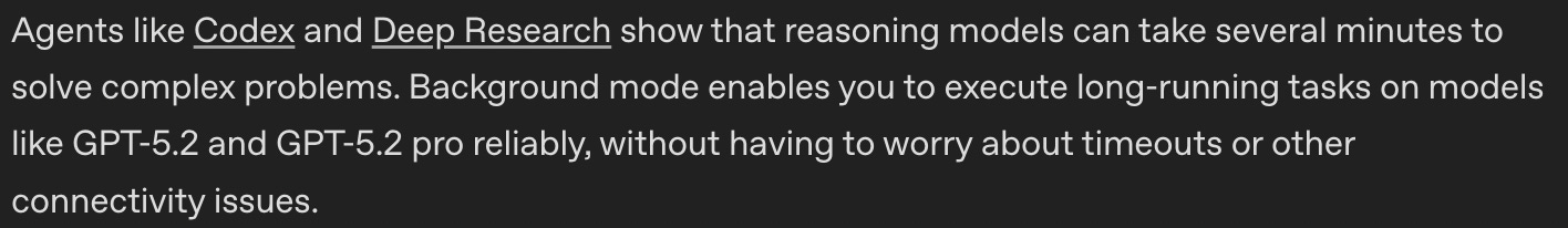 Agents are now designed to run for “several minutes” to “tens of minutes,” which forces durable state (memory) and job semantics. OpenAI’s docs explicitly position Background mode for long-running tasks and note that agentic systems can take several minutes, while “Deep research” tasks can take tens of minutes