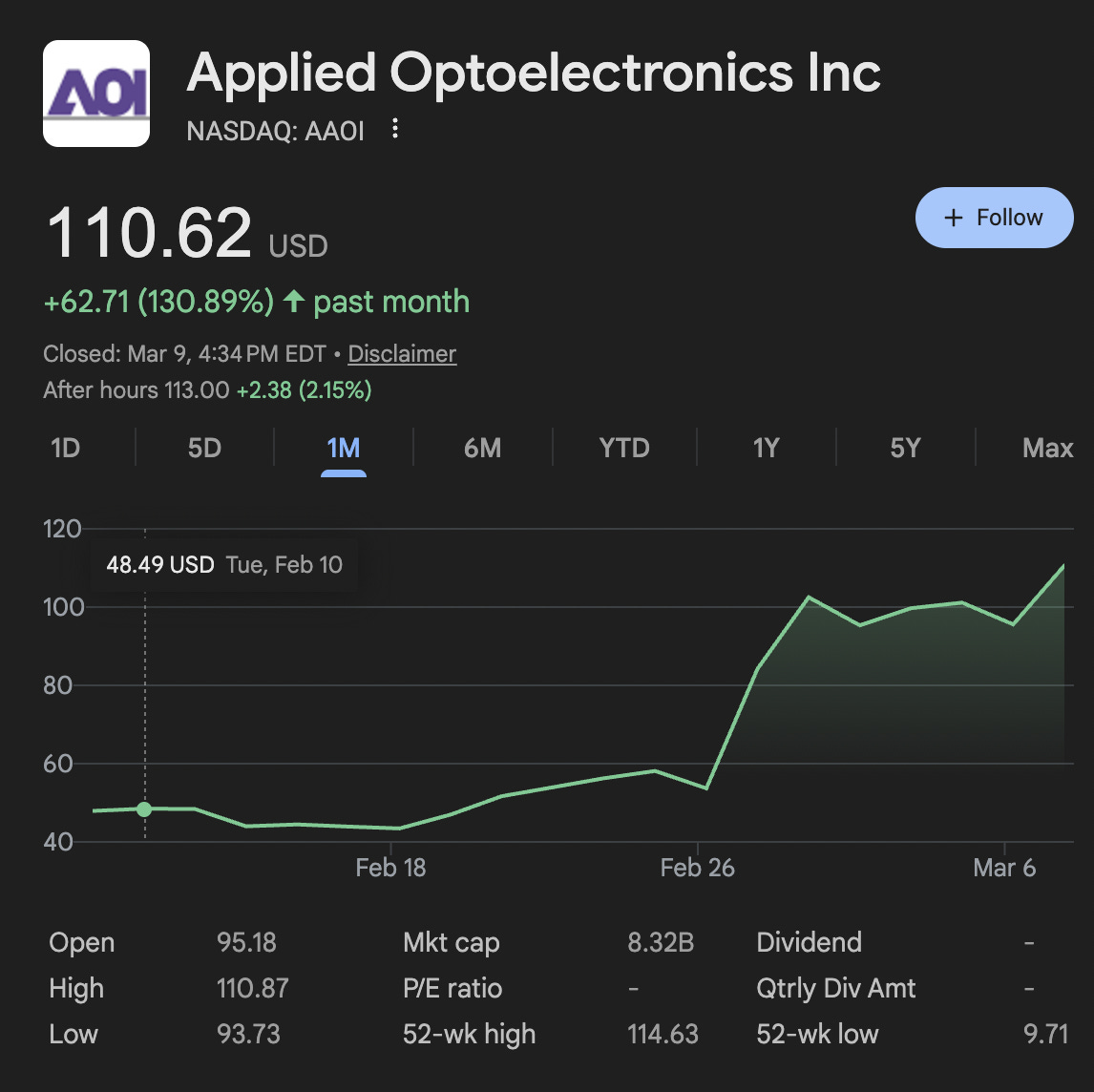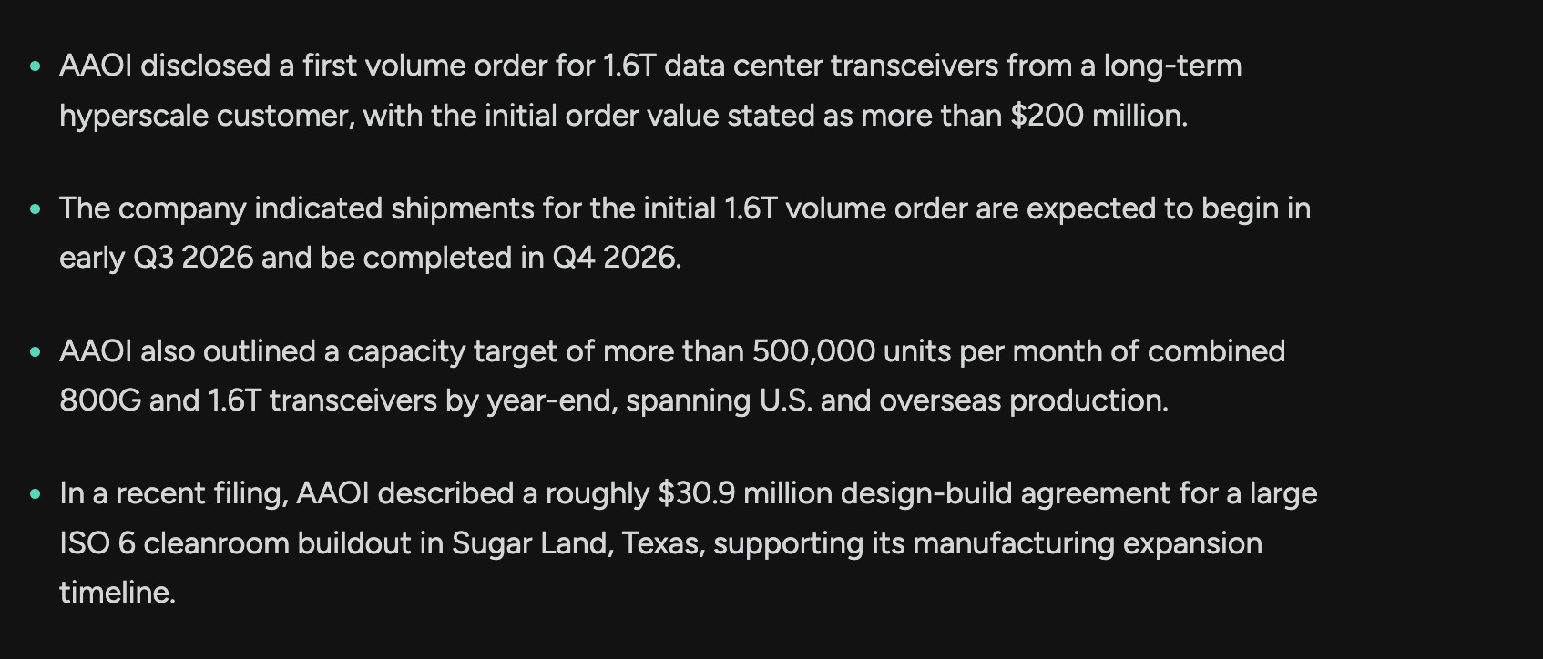 Today, On March 9th, Applied Optoelectronics announced that it received its first volume order for 1.6T data center transceivers from a major hyperscale customer possibly suspected Amazon and the stock jumped! Our clients are wondering ,Why would a hyperscaler choose AAOI for transceivers over Coherent / Lumentum / Broadcom? And if their InP manufacturing capacity is a real moat?