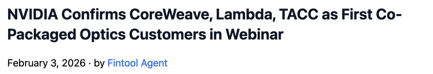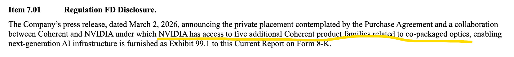 Coherent makes the linkage explicit in its own 8‑K, disclosing that the collaboration expands NVIDIA’s access to “five additional product families related to co‑packaged optics,” while NVIDIA has already telegraphed CPO networking as a path to scaling “AI factories” via Quantum‑X Photonics and Spectrum‑X Photonics.