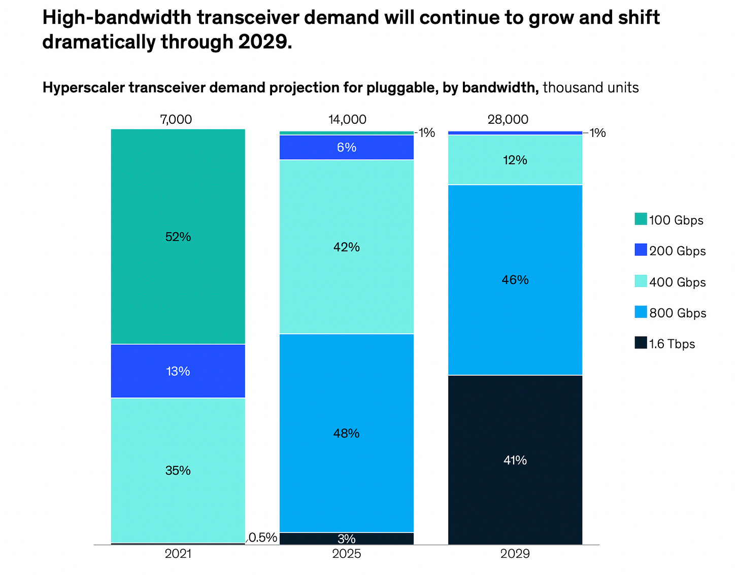 Hyperscaler bandwidth mix shift (demand pull): McKinsey projects hyperscalers will shift ~87% of back-end optics to 800G and above by 2029, with 1.6T transceivers >40% of that back-end demand.
