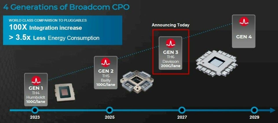 Broadcom CPO shipping (hyperscaler early deployments): The Next Platform reports Broadcom’s second-generation CPO (“Bailly”) Gen 1 began shipping to hyperscaler customers in 2023 and provides concrete per-port power comparisons versus pluggables.