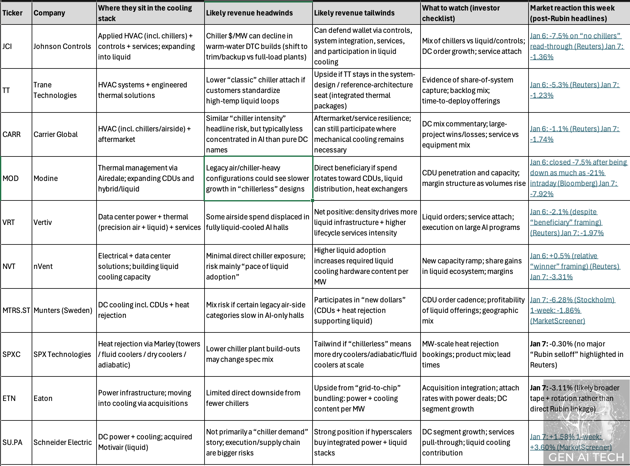 Here is an expansion on the specific tickers your clients are asking about, structured to clarify why they are moving and whether the market’s reaction is a signal or noise. Investors are currently scrambling to re-rate these companies based on who owns the “new” loop (CDUs/Manifolds) versus who owns the “old” loop (Chillers/CRAHs).