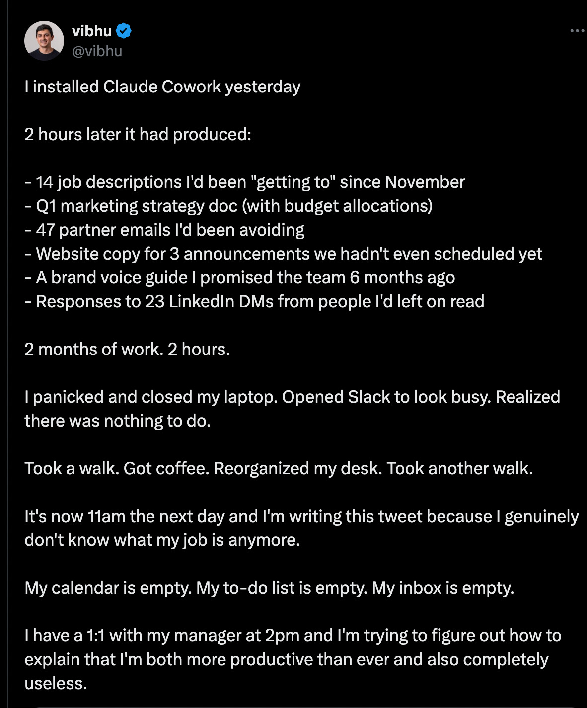 What made Cowork land as an investor-grade catalyst was the combination of (a) outcome execution in a mainstream desktop form factor and (b) the speed at which it was shipped. Anthropic staff described Cowork as built in roughly “a week and a half” / under two weeks, with reporting that Claude itself coded “pretty much all” of it and that developers were running ~3 to 8 Claude instances in parallel to implement and debug features. In other words, the product was a live demo not only of automation, but of software production velocity.