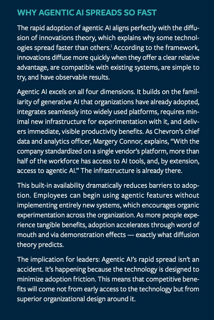Takeaway is because the infrastructure and user familiarity from GenAI are already in place, agentic features can spread organically without major new deployments. That means competitive edge will come less from “having access first” and more from how well leaders redesign workflows, controls, and incentives around agents.