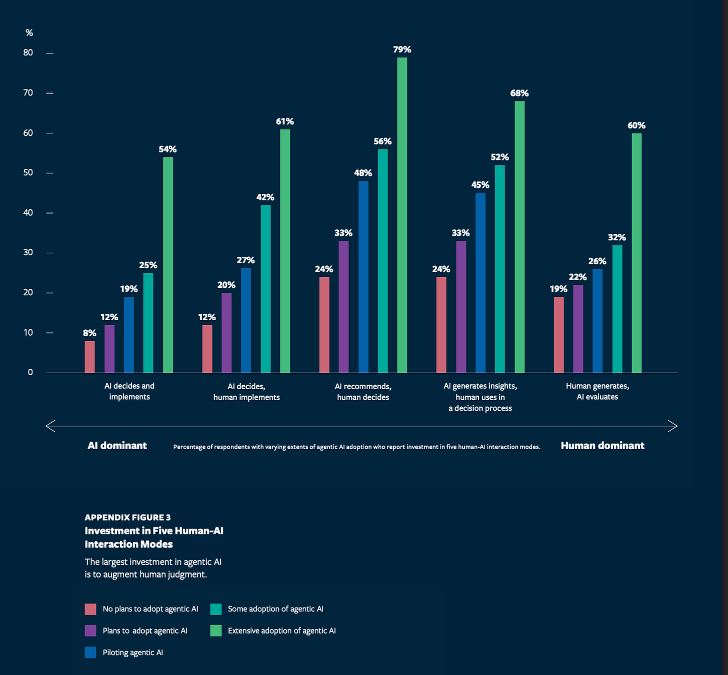 But the largest impact of agentic adoption is augmenting human judgment: 79% of extensive agentic AI adopters say they are investing in using AI to generate insights for a human decision maker.