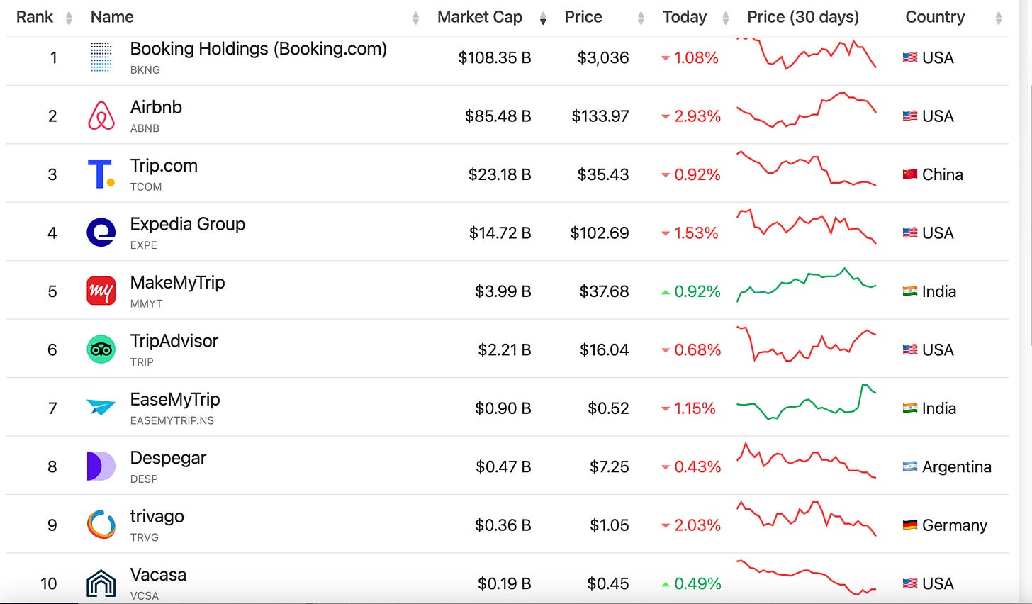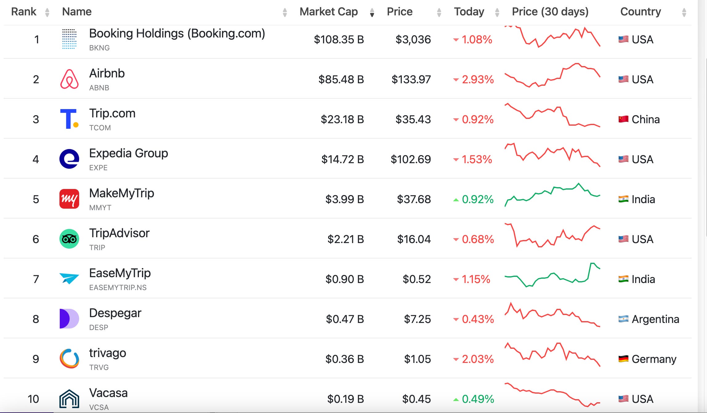 Let's delve into the market domain TripAdvisor operates within. The first one in the chart below with highest cap - Booking Holdings (owns Booking.com, Priceline, Agoda, and Kayak - about 25% market share). Booking has 28 million reported listings worldwide. Its initial success is often attributed to its agency model and aggressive M&A strategy. Tripadvisor comes on the 6th rank here. Vacation Rental Platform Airbnb has done well in recent years.