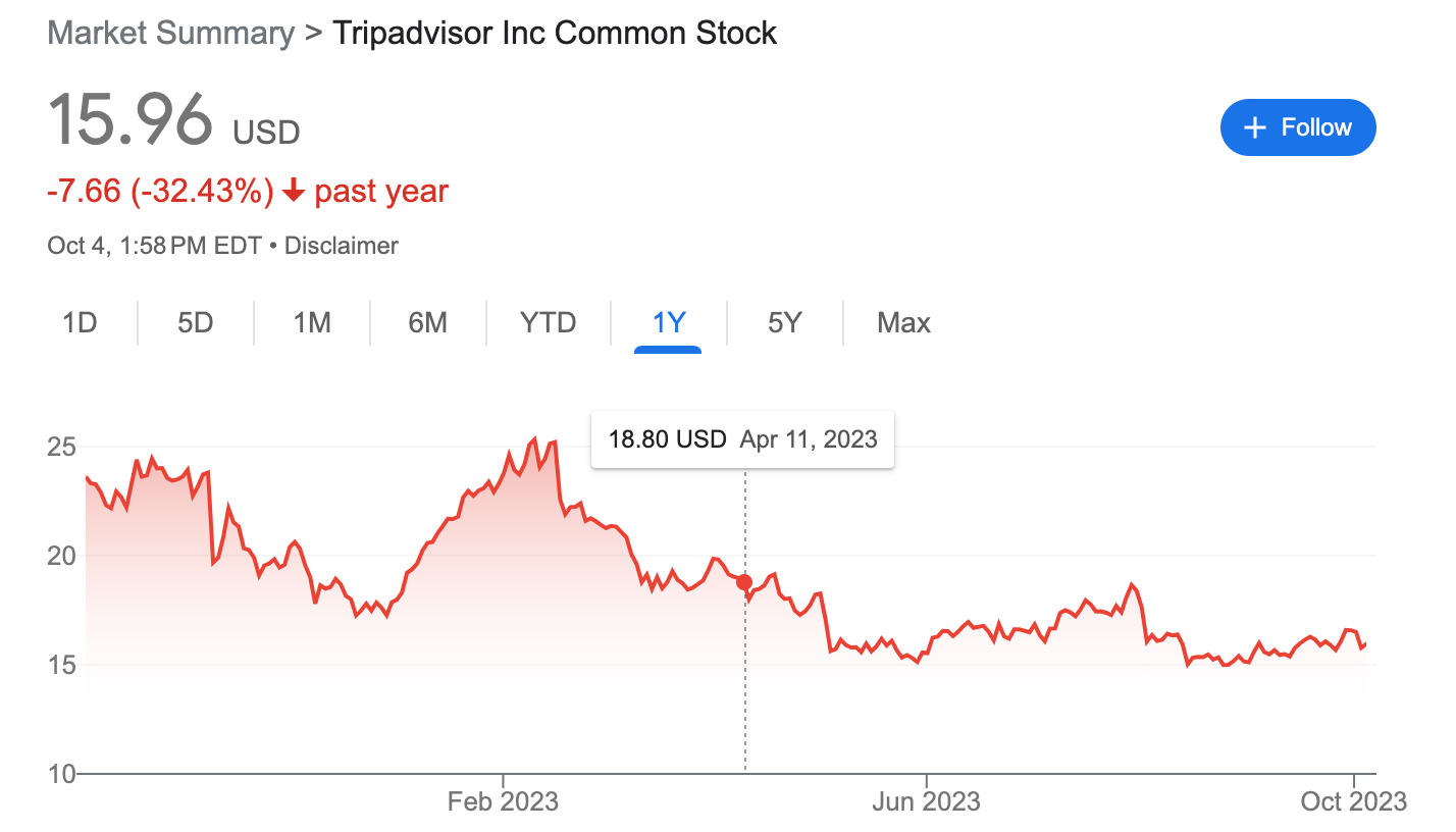 Just for a moment, let’s talk about Tripadvisor’s recent performance. It is estimated to be 30% undervalued based on current share price of US$15.96.