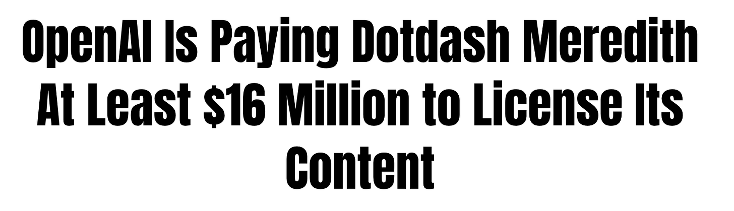 At the high end, the News Corp–OpenAI deal (announced in 2024) is reportedly worth more than $250 million over five years. OpenAI didn’t just buy headlines—they licensed revenue retention. The News Corp deal marks a new era where quality content becomes recurring margin in the AI stack
