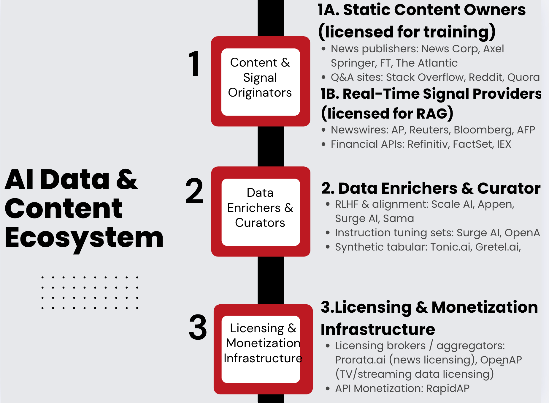 To understand how the generative AI economy is forming around data, we need to first map the emerging ecosystem of content and infrastructure players shaping the flow of information into foundation models.