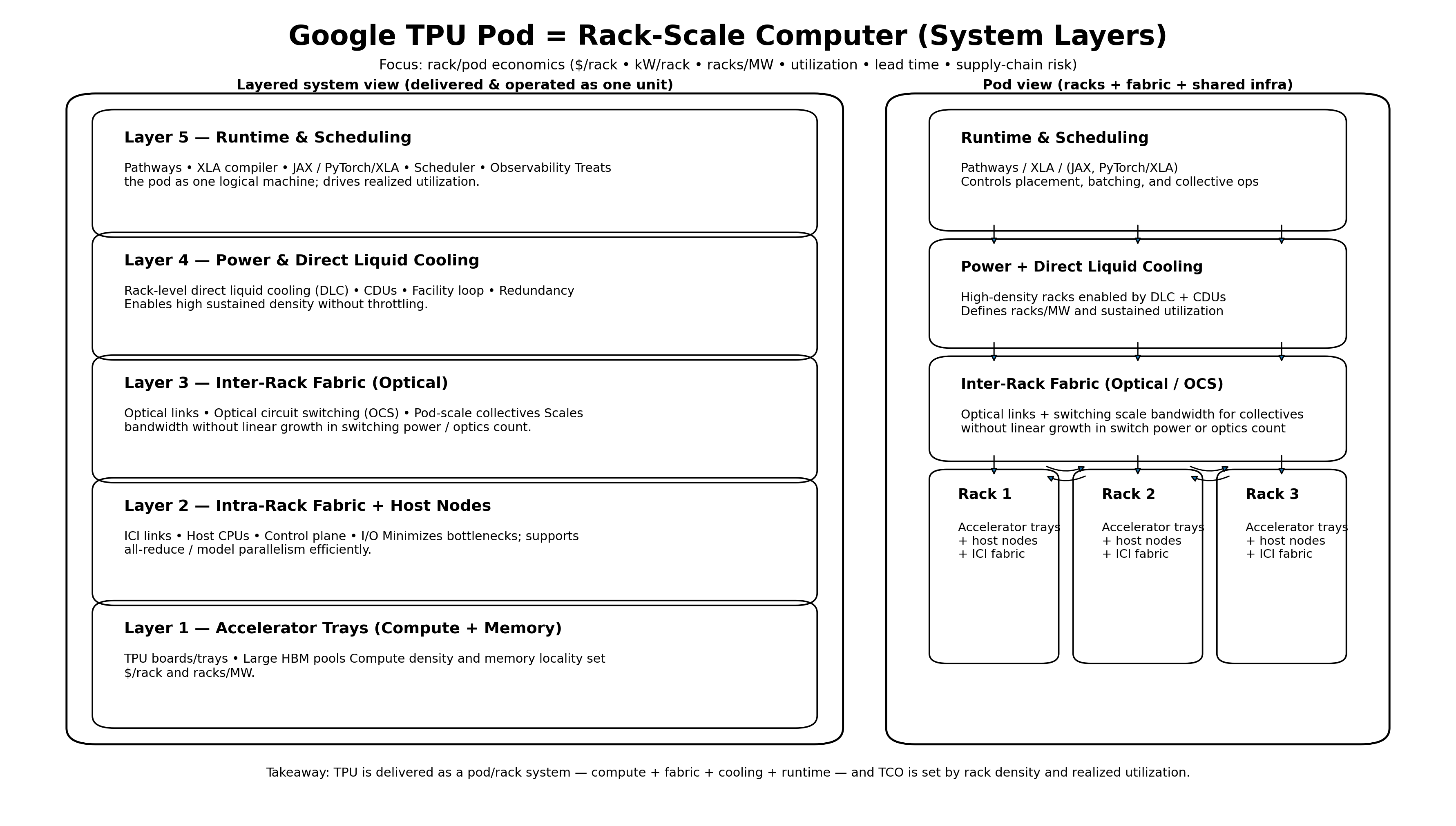 These layers are co‑designed and deployed together, and the economic outcome—$/rack, racks per megawatt, utilization, and speed of deployment—is determined by how well they work as a unified system. Focusing on any single layer in isolation misses the point: Google’s advantage emerges from integrating all layers into a rack‑scale computer with predictable cost and performance at scale.